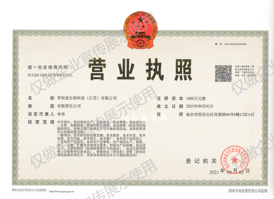 2025年9月2日,萃和堂生物科技(江蘇)有限公司(簡稱“萃和堂”)正式成立,統一社會信用代碼:91320114MAEW6WFN5L,注冊資本金1000萬元。由新立訊科技集團股份有限公司、北京金來順投資有限公司與遵義廖元和堂藥業有限公司按17:2:1聯合投資設立。“萃和堂”將依托青海省的枸杞、蟲草、鹿茸、黃精等特色農產品資源,深度融合中華老字號“廖元和堂”與“中國非遺”發酵工藝飲片(含片)生產資質與成熟技術,從初加工農產品到精制加工的中藥飲片(含片)系列大健康消費品,助力“青貨出青”鄉村振興戰略。