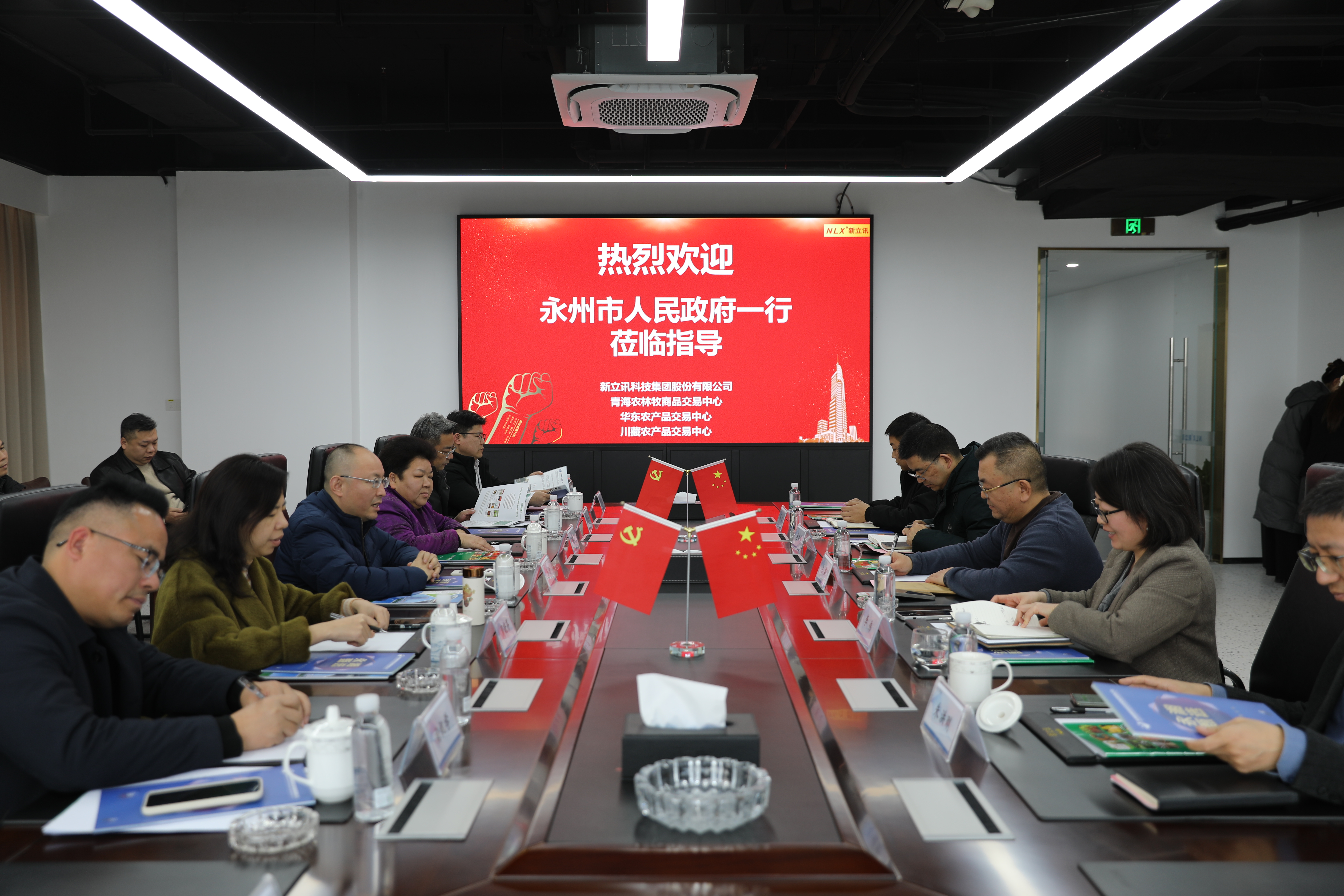 2026年1月27日,永州市人民政府副市長李欽,永州市農業農村局局長唐慧云,永州市商務局局長周曉芬,永州市港發集團供應鏈公司董事長陳震源,永州市農業綜合服務中心主任楊祝學及永州商會副會長魏世喜等調研新立訊總部。新立訊科技集團董事長(兼青海、華東、川藏農產品交易中心董事長)毛霖,常務副總經理李偉及集團農產業互聯網團隊陪同調研。