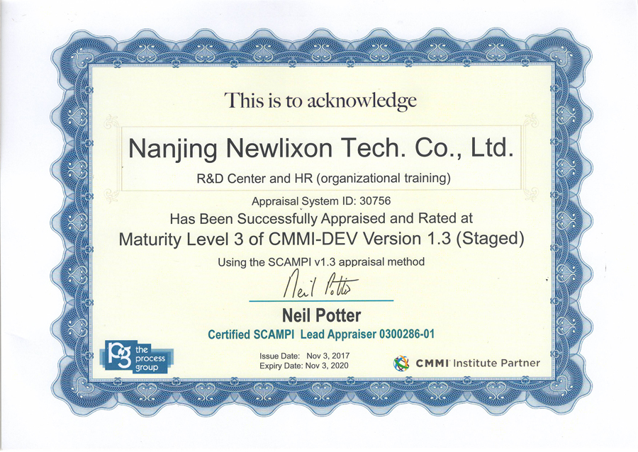 2017年11月3日,在公司會議室舉行的CMMI3級認證結果發布會上,CMMI研究所外籍主任評估師Neil Potter向公司高層和參與的評估項目組成員正式宣布:經過嚴格的一周現場審核和評估,南京新立訊科技股份有限公司已經達到軟件成熟度CMMI 3級,成功通過CMMI 3級認證。這標志著南京新立訊在軟件研發標準化流程、過程改進、項目管理等方面達到先進水平,可為國內外客戶提供更高技術水平、更高質量的軟件開發整體服務。