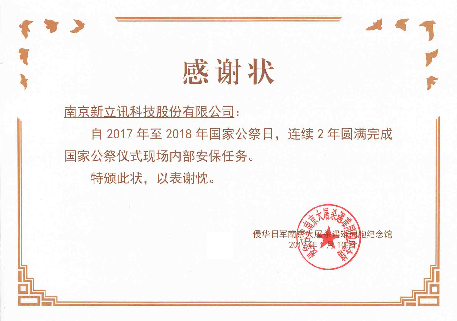 近日,南京新立訊科技股份有限公司收到侵華日軍南京大屠殺遇難同胞紀念館感謝狀,對新立訊在2017至2018連續兩年圓滿完成國家公祭儀式現場內部安保任務表示感謝。
