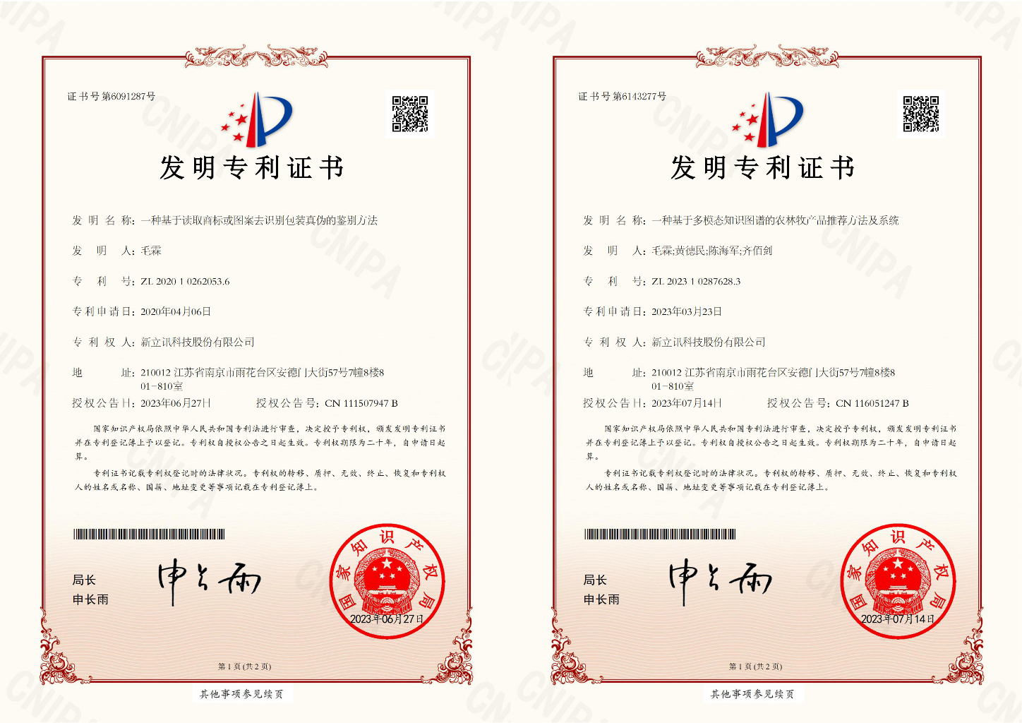 7月,新立訊知識產權領域再獲兩項發(fā)明專利,分別是“一種基于讀取商標或圖案去識別包裝真?zhèn)蔚蔫b別方法”(專利號:ZL202010262053.6),“一種基于多模態(tài)知識圖譜的農林牧產品推薦方法及系統(tǒng)”(專利號:ZL202310287628.3)均為我司原始取得,是技術創(chuàng)新和研發(fā)方面取得的重要成果。